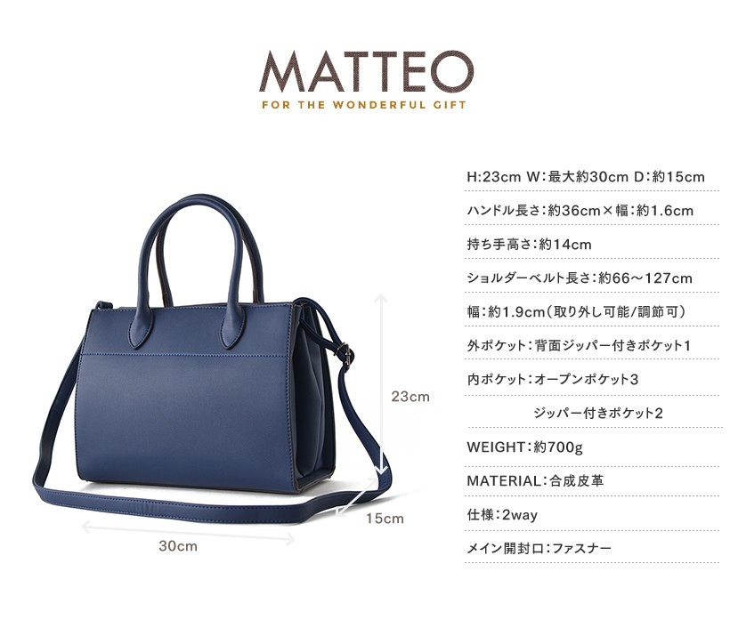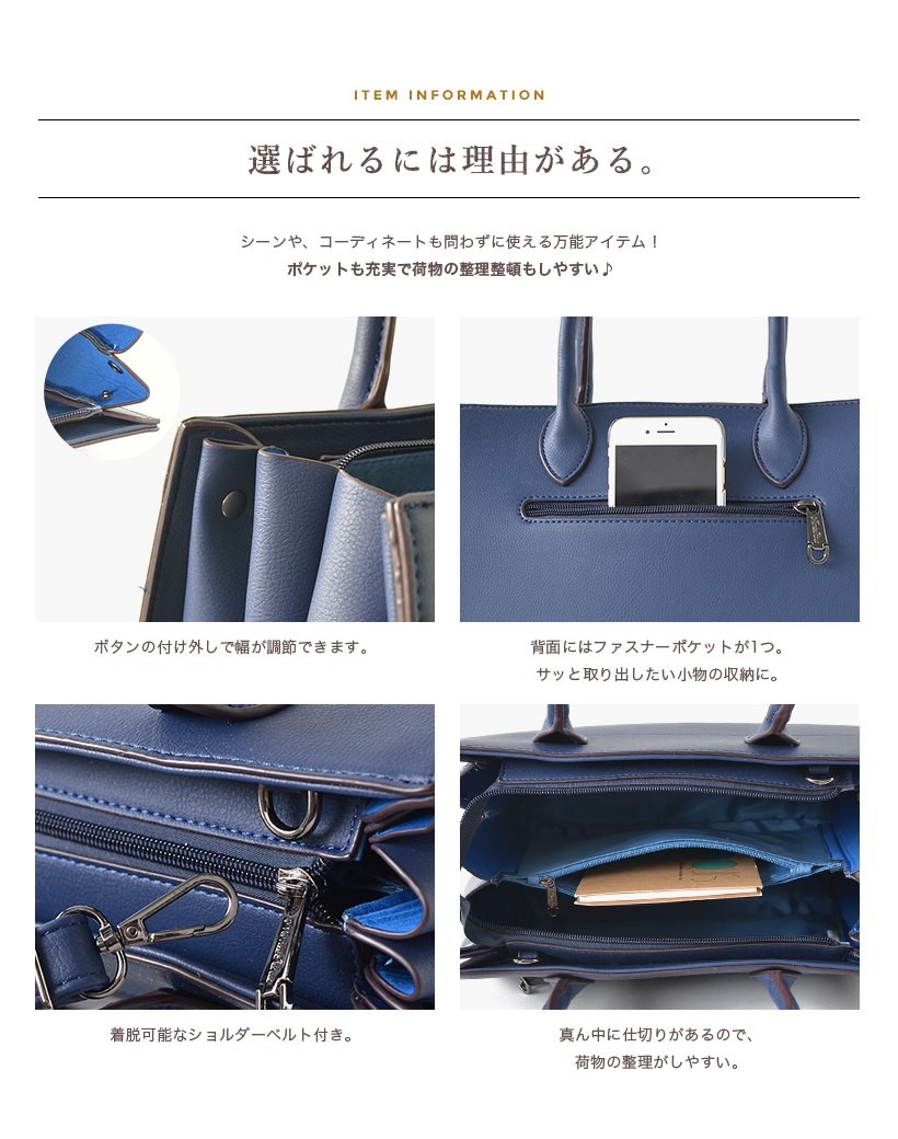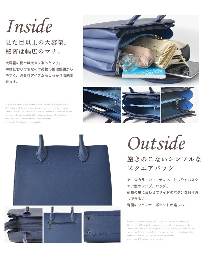 シンプルで、カッチリとしたフォルムなのでお仕事にピッタリな2wayトートバッグ。サイドが蛇腹になっていて、たっぷり収納が可能!●SIZE:幅最大:約30cm / 高さ:約23cm / マチ:約15cm●ハンドル長さ:約36cm×幅:約1.6cm、持ち手高さ:約14cm●ショルダーベルト長さ:約66~127cm×幅:約1.9cm(取り外し可能/調節可)●外ポケット:背面ジッパー付きポケット1●内ポケット:オープンポケット3、ジッパー付きポケット2●重さ:約700g●素材:合成皮革●仕様:2way●バッグのメイン開閉口はジッパーになっております。