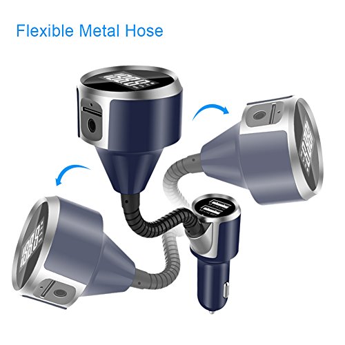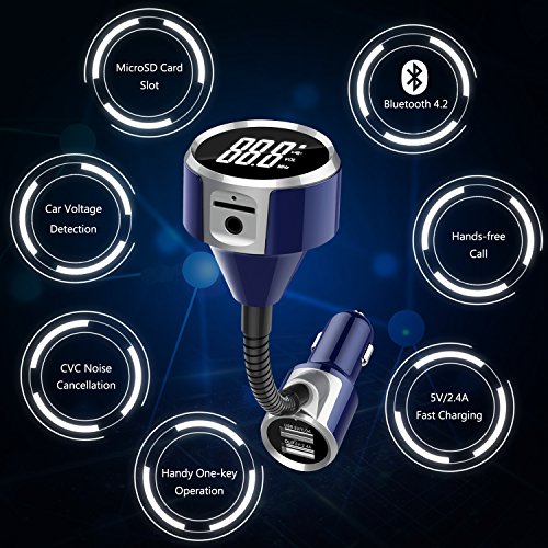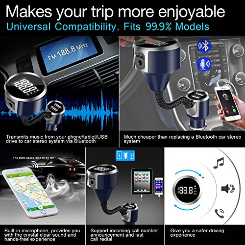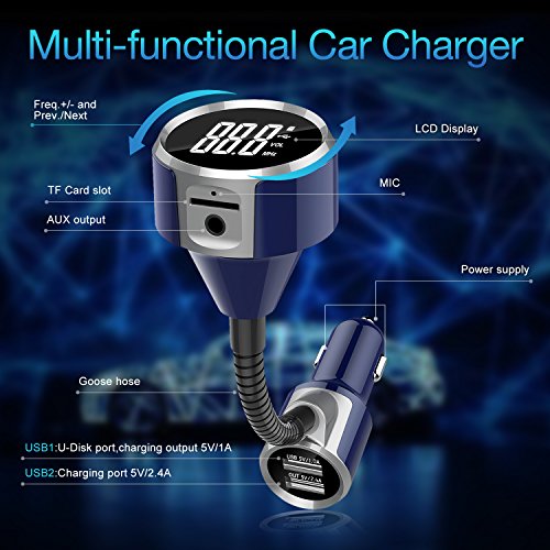Dual USB Ports & MicroSD Card Slot - One 5V-2.4A USB charging port to get your phone full charged in short time, and the other is designed for reading USB files and can charge most USB devices, supports TF/MicroSD Card in FAT format up to 32G; supports A2DP; supports MP3/WMA format songs in Norma0l/Shuffle/Repeat play modes while the mp3 fm transmitter plays TF Card or USB flash drive.