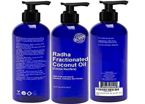 Ready for the BEST oil used for massages, therapeutic recipes, skincare, Haircare AND essential oils? Discover the new 100% pure and Natural Radha Beauty Fractionated Coconut Oil. Our oil is Liquid, Odorless, Colorless, Non Greasy & Non Staining . Some of the amazing benefits and uses are 1- Excellent on skin, fantastic natural moisturizer 2- Can be mixed with other carriers and essential Oils 3- Predominantly composed of saturated fatty acids 4- Does not go rancid and has a very long shelf life 5-Great massage oil that can be mixed with other essential oils such as lavender and peppermint 6-Tames Frizzy hair and also works as a great moisturizer 7- Add some Radha Beauty Fractionated Coconut Oil with a few drops of Radha Argan Oil along with our essential oils - Radha Lavender Oil and/or Radha Peppermint oil to your hot bath and ENJOY!Feature