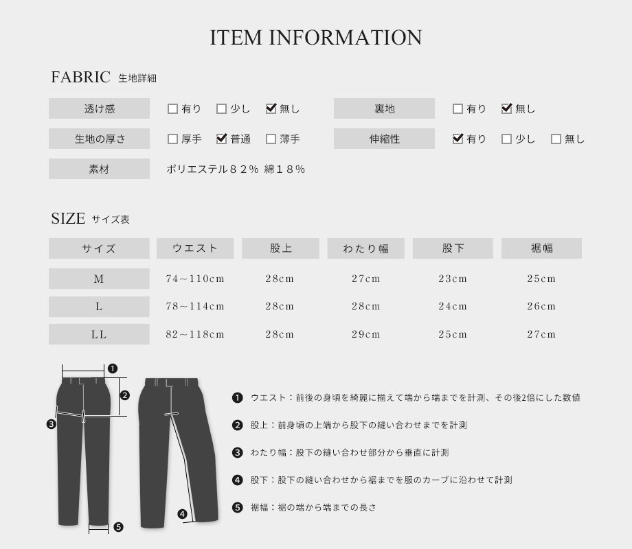 サイズ(ウエスト/股上/わたり幅/股下/裾幅)※cm: