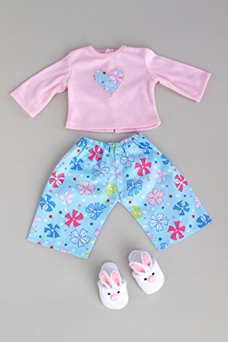 Pink cotton pajama top with decorative heart, blue caprice and white bunny slippers.