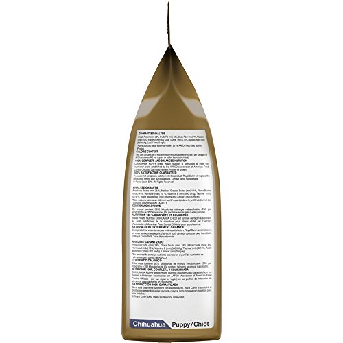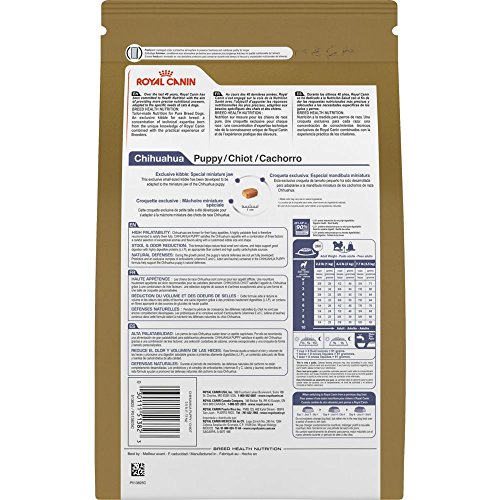 -. Binding : Misc. -. Brand : Royal Canin -. Department : dog-dry-food -. EAN : 0721449578270 -. Feature : Highly digestible proteins to help reduce stool odor and quantity / Small size, shape and density kibble that is easy to break and chew / Chihuahua puppy, small kibble, fussy / For Chihuahua puppies from 8 weeks to 8 months -. Label : Animal Supply Company (RC) -. LegalDisclaimer : Must be at least 18 & over to purchase. Items only ships within United States. -. Manufacturer : Animal Supply Company (RC) -. Model : RC513825 -. MPN : RC513825 -. PackageQuantity : 1 -. PartNumber : RC513825 -. ProductGroup : Pet Products -. ProductTypeName : PET_SUPPLIES -. Publisher : Animal Supply Company (RC) -. Size : 2.5 pounds -. Studio : Animal Supply Company (RC) -. Title : ROYAL CANIN BREED HEALTH NUTRITION Chihuahua Puppy dry dog food, 2.5-Pound -. UPC : 721449578270