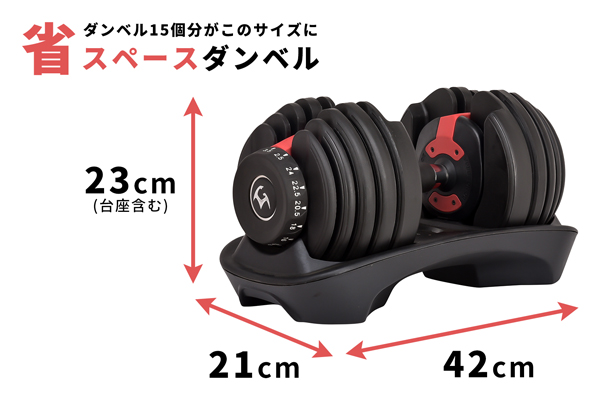 ●2.5kg~24kgの間を15段階で調節可能なアジャスタブルダンベル。