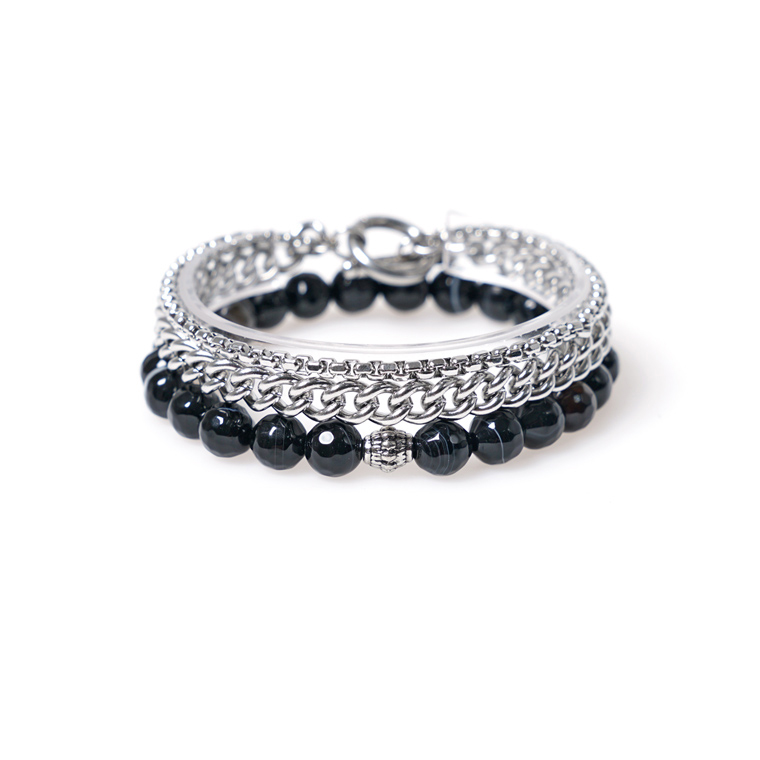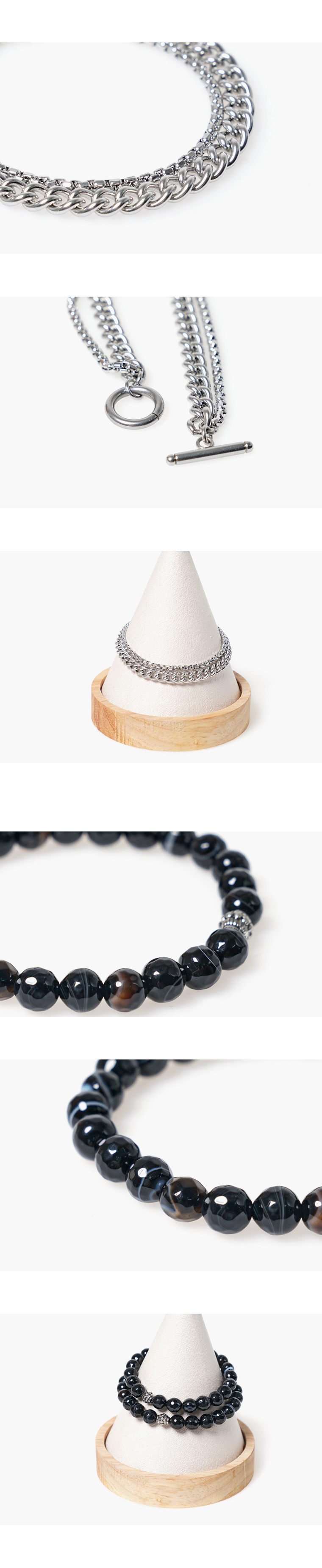 커티드 가공된 블랙마노석을 이용해 제작된 원석팔찌와 가볍게 착용하기 좋은 슬림한 디자인의 더블체인팔찌로 이루어진 팔찌세트입니다. 원석팔찌는 마노석 특유의 패턴과 컷가공으로 은은하면서도 고급스럽게 제작되었습니다. 전체적으로 깔끔하고 단정한 느낌으로 단품으로 착용하기 좋으며, 슬림한 악세사리와 함께 레이어드해도 잘 어울립니다. 체인팔찌는 부담없는 크기의 두가지 타입의 체인이 레이어드 된 디자인으로 남녀 모두 가볍게 착용하기 좋으며, 청량감 좋은 실버 컬러로 은은하게 착용하기 좋습니다. 또한 써지컬스틸로 만들어진 체인을 사용해 변색이나 알러지 걱정이 없도록 했습니다. 댄디한 코디에 심플하게 포인트로 착용하거나, 가죽이나 원석으로 만들어진 팔찌와 함께 착용해도 좋습니다. 사이즈는 남성용, 여성용, 주문제작이 가능합니다.