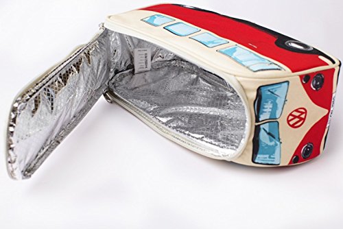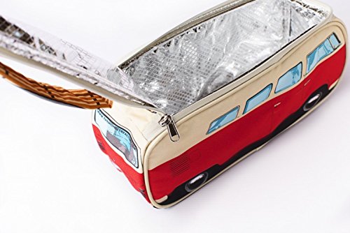 FEATURES: Fun Oxford Canvas lunch bag shaped like a VW camper van. Includes a surfboard-shaped handle. Fully Insulated Aluminum Foil Interior. Hand Wash Only; Do Not Tumble Dry