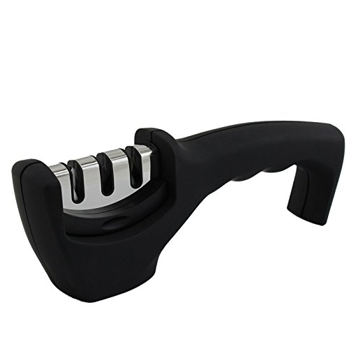 DURABLE, COMFORTABLE, SAFE AND EASY TO HANDLE - Solid ABS plastic body with Ergonomic Design. NON-SKID RUBBER BASE holds the knife sharpener securely in place during use.
