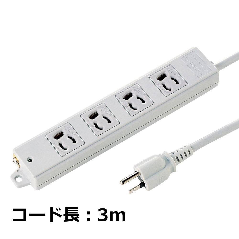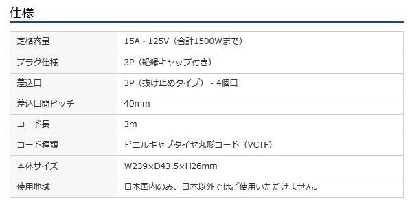 4個口(3P抜け止め)、VCTFコード仕様、3Pプラグ(絶縁キャップ付き)のタップです。電源状態が確認できる通電ランプ付きです。裏面にマグネットが付いているので、スチールのデスクなどに仮固定することができます。メンテナンスがしやすく便利です。 |
