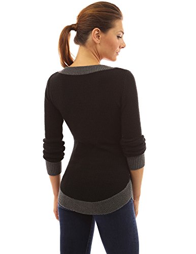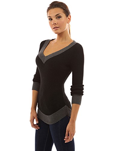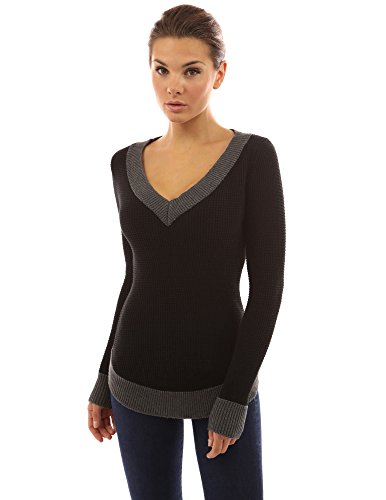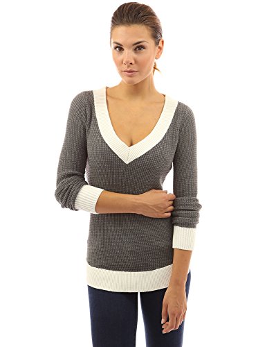 PattyBoutik Cotton Blend V Neck Color Block Long Sleeve Pullover Sweater. Model in pictures is 5 feet 8 inches (173cm) tall wearing size S.
