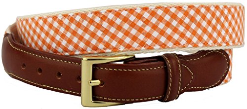 Studio : Country Club Prep Publisher : Country Club Prep Binding : Apparel Product Description - 1" orange and white cotton gingham ribbon belt on 1 1/4" natural canvas cotton woven canvas backing - Top quality British Square brass buckle - Handwaxed Nubuck leather tabs - Fine yellow feathered edge stitching finishing detail to the leather - Made in the USABE SURE TO ORDER your belt 2 INCHES LARGER than your pant waist size. For example, if you have a 34 inch waist, you would choose a 36 inch belt. 0