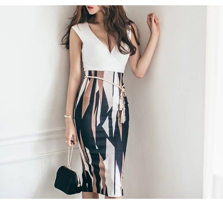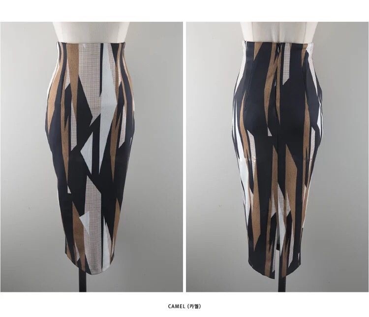 カシュクール風ノースリーブニットと幾何学模様のタイトスカートのセットです。