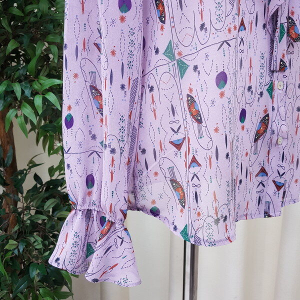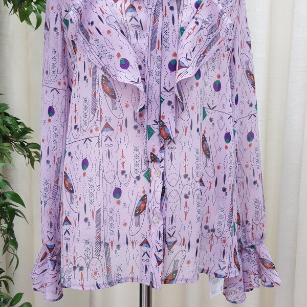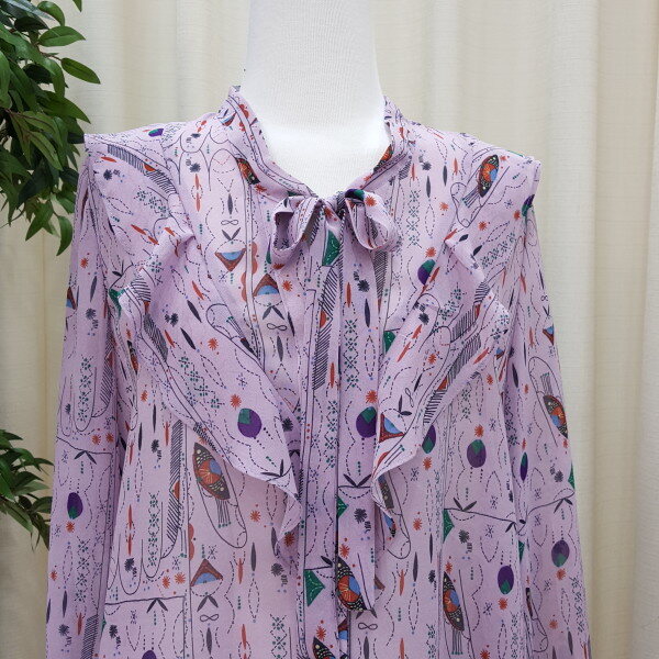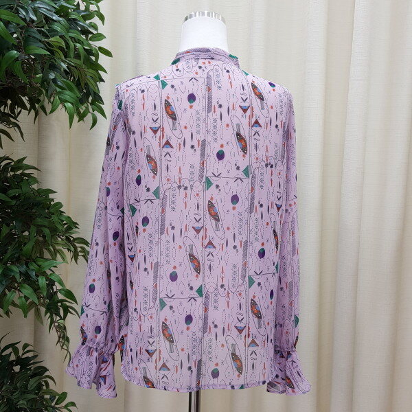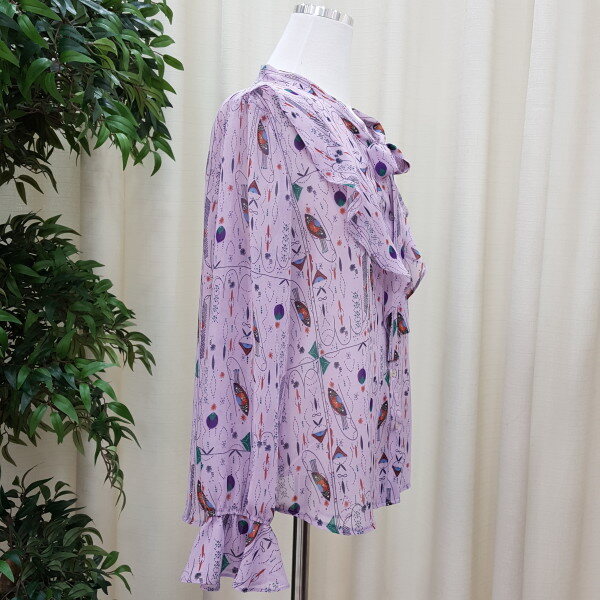 천안모다아울렛 멜로디가든 2018년 봄신상 기하학적 패턴 블라우스입니다소매 프릴이 귀엽고 앞 리본과 프릴이 깔끔한 스타일의 블라우스입니다 기하학적 패턴이 세련된 스타일의 제품입니다