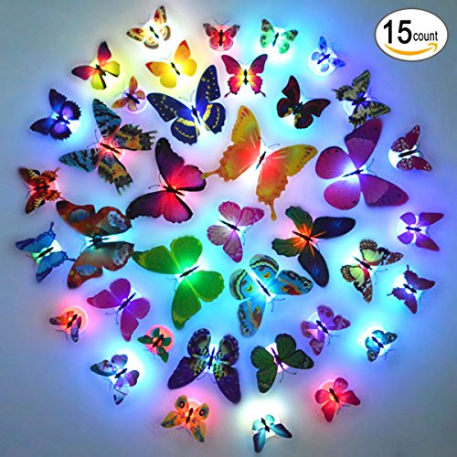 Glow in the Dark LED Butterflies for Party Wedding, Light Up Butterfly for Kids Room Nursery Wall Decoration, Cool Party Supplies - Random Color Set of 15