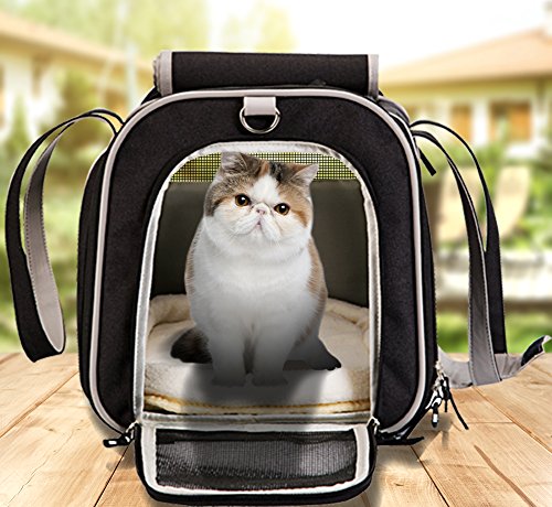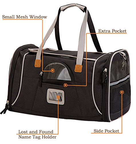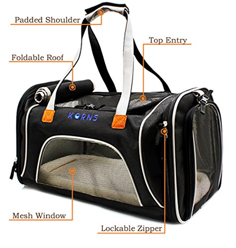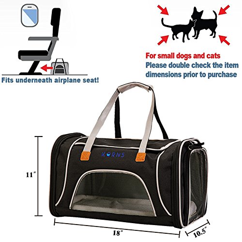 -. Feature : [Airline Approved Cat Carrier ] Sest for pets up to 14 lbs and size within 17.5"L x 10"W x 11"H. Please measure your pet size before purchasing. The cat travel carrier is designed for medium cats and small dogs . It meet major airline regulations of under forward seat compatibility. Besides, the side pocket allows for easy storage of toys, treats and other supplies which can make your cats feel relax. / [Ultra Pet Comfort] The pet carrier can open on both the top and the sides for easy loading. And this kind pet travel tote bag is well ventilated with strong mesh windows on 3 sides that allow for maximum viewing and ventilation. The 360 degree mesh panel view design make it more comfortable and very breathable for the pet. Allowing your pet to be able to see its surroundings. With removable ultra-soft fleece pad, this soft sided pet carrier ensures total comfort for your furry friend. / [Emphasis On Pet Safety] Upgraded tear-resistant mesh and polyester fabric make the carrier bags for dogs stronger and more durable, while the rigid insert panel helps the carrier hold its shape. The lockable zipper design of mesh window and built-in leash ring secure your pup in place well, and even reflective strips for night visibility. The collapsing roof also can be closed or rolled down for P.R.Ivacy and security. / [ Easy to Carry & Clean] The airline pet carrier under seat travel bag comes with an adjustable clip-on shoulder strap and padded hand strap for hassle free portability. That means it is just as easy to carry using either the handles or the adjustable strap. And the lage strap give you superior portability. Including removable soft fleece mat, the pet carrier can be washed easily. / [100% SATISFACTION GUARANTEE] KQRNS only authorize "QUANRAN US STORE" to sell. Simply return the product for a no questions asked refund if not satisfied. Order now . Take the lightweight carrier with pets for your trip.