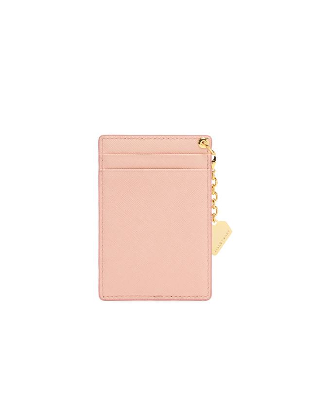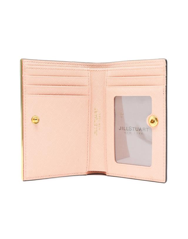 내부 베이비 핑크 배색으로 여성스럽고, 심플한 외관을 보여주며, 하단의 로고와 골드 바 장식으로 포인트를 준 2단 반지갑입니다.
