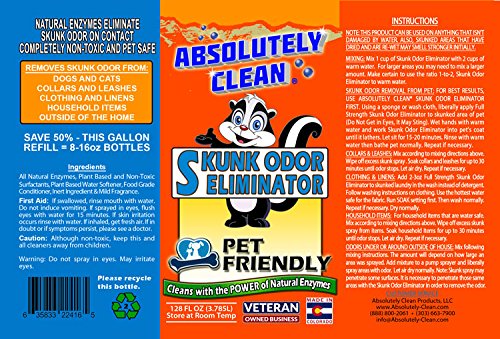-. Binding : Misc. -. PackageQuantity : 1 -. ProductGroup : Pet Products -. ProductTypeName : PET_SUPPLIES -. Title : Absolutely Clean Skunk Odor Eliminator - Often Works in One Wash - Powerful Natural Enzymes Eliminate Odor on Contact - Made in Colorado - Veteran Owned Company