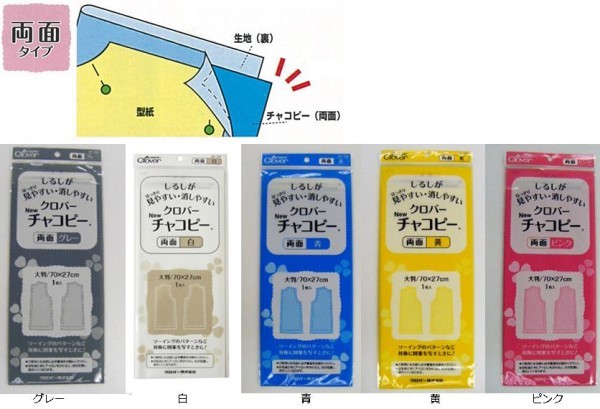 クロバーチャコピーがパッケージも中身も新しくなりました!!両面タイプはソーイングのパターンなど対称に図案を写すときに。はっきりとしたしるしを付けることができ、付けたしるしは水洗いで消せます。 |