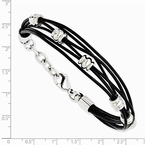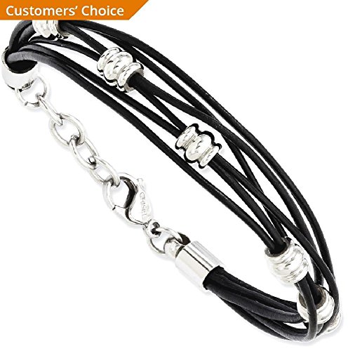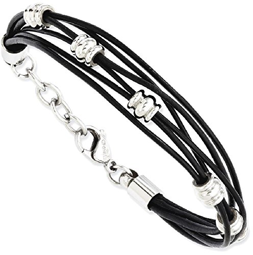 ICECARATS DESIGNER JEWELRY STAINLESS STEEL BLACK LEATHER BEADS 8 INCH .75EXTENSION BRACELET 7.5 INCH