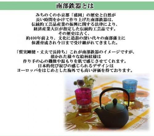 | 岩手県で受け継がれる伝統の技をご自宅に!!南部鉄器で沸かしたお湯は、口当たりが豊かで、まろやかになると言われています。お茶はもちろん、食べ物にもおススメです。日々の生活にぜひご利用下さい。 |