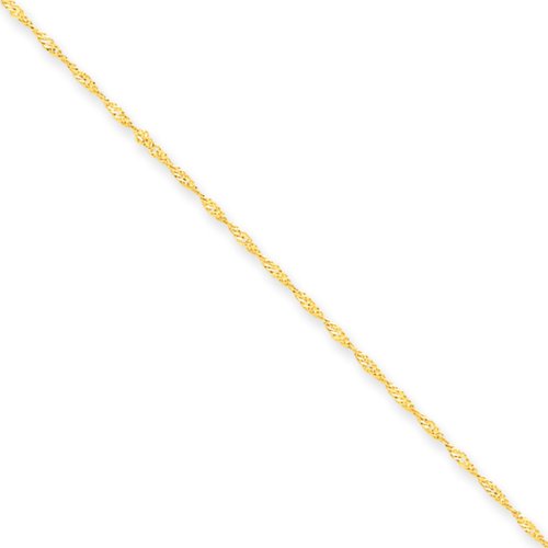 This 1mm width, diamond-cut Singapore chain is crafted from 14k yellow gold and closes a spring ring clasp. Children's 14-inch length.
