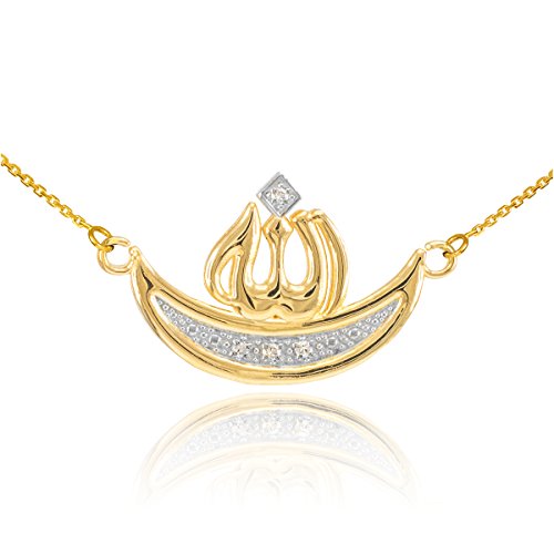 -. Binding : Jewelry -. Brand : Middle Eastern Jewelry -. Department : womens -. Feature : fine Muslim religious jewelry featuring the proper name of God in Arabic script and a diamond-studded crescent moon / faithfully handcrafted with solid 14 karat 2-tone white and yellow gold in polished finish and individually hand-set with a natural white diamond accent / comes with free special gift packaging / made in the USA yet offered at factory direct jewelry price / ships from the manufacturer directly to the customers -. Label : Claddagh Gold -. Manufacturer : Claddagh Gold -. Model : CMN948 -. MPN : CMN948 -. PartNumber : CMN948 -. ProductGroup : Jewelry -. ProductTypeName : FASHIONNECKLACEBRACELETANKLET -. Publisher : Claddagh Gold -. Studio : Claddagh Gold -. Title : 14k Two-Tone Gold Diamond Crescent Moon Islamic Allah Name Necklace