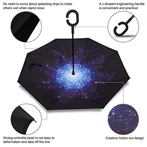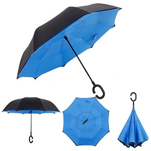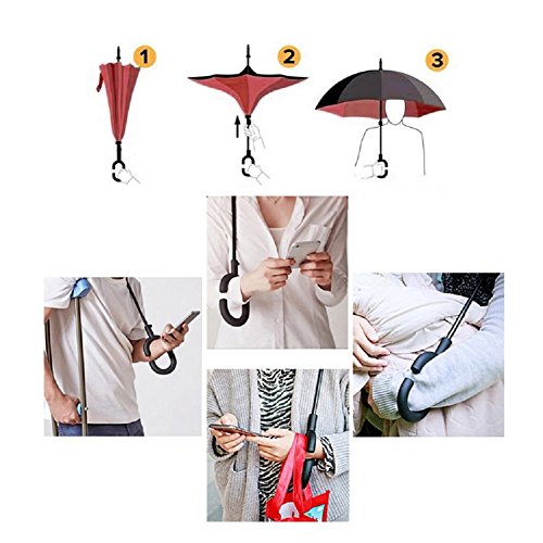 -. Feature : ★ Double protection - anti-rain and anti-ultraviolet, reverse inverted umbrella, at any time to prevent the storm. / ★ Unique design: open the door, you can open the inverted umbrella, do not get wet, when you close the umbrella, back to the car, the water stopped in the umbrella inside, can not get the car floor we / ★ Durable windproof: double umbrella by the sponge cloth, durable black ribs and double ribs, so that the car is more solid, and enhance its wind / ★ Handle C: Elastic paint covered, the handle is comfortable to hold and will release your hands if you wish, so that you can carry objects in the rain. / ★ Hand and dripping free: For mobile phone users and mothers, apply to the arm on the C-shaped handle, if necessary, you can carry free baby, bag or cell phone. Creative investment design, inside and outside design to prevent water dripping, keep the floor and the car dry.