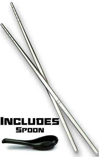 Reusable Chopsticks Titanium Travel Chopstick Pair in Silver Case with Soup Spoon for Japanese, Chinese, Korean & Asian Dishes - 9 Inch - Lighter than Steel - In Presentation Box & Dishwasher Safe