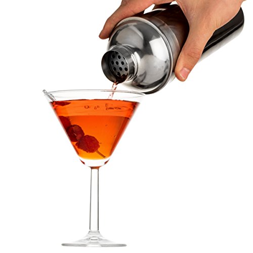 -. Feature : This FineDine drink mixer set has several necessary tools for making perfect cocktails every time. Included is a 26 ounce cobbler shaker, a ¾ oz and 1 ¼ oz double jigger, a red knob bar spoon, a flat 2 sided bottle opener, and 2 stainless steel and rubber pourers. / This cocktail shaker set is made with durable stainless steel that prevents the cocktail making kit from retaining odors or staining. The drink mixer shaker set metal construction also has a chilling effect that enhances flavors. / Shake or stir your drinks! An included bar spoon allows you to mix cocktails, while our all-in-one shaker allows you to shake and strain cocktails without extra tools! An included spill proof lid makes shaking mess free. / A heavy duty, flat bottle opener opens soda, beer, and liquor bottles with ease. A double cocktail jigger allows you to measure the perfect amount of alcohol for drinks, while 2 stainless steel and rubber pourers allow you to attach them to bottles for seamless pouring of liquors! / With easy hand wash and dishwasher care this professional bar essentials kit will be ready to use again and again! This cocktail shaker kit comes in posh, secure packaging; perfect for gift giving.