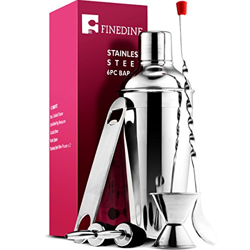 -. Title : FineDine Expert Cocktail Shaker Home Bar Tool Set Stainless Steel Bar Set with Shaking Tin, Bar Spoon, Double Jigger, 2 Stainless Steel Bottle Pourers, Tapered Spout, and Flat Bottle Opener (6 Piece)