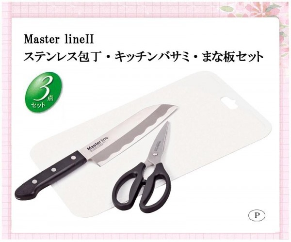 | 包丁、キッチンバサミ、まな板の3点セットです。 |