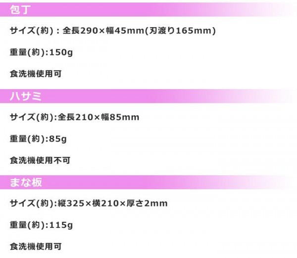 | 製造国 | 包丁・はさみ:中国、まな板:日本 |