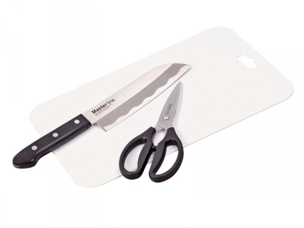 包丁、キッチンバサミ、まな板の3点セットです。 |