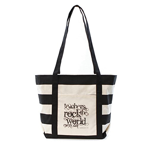-. Brand : Teacher Peach -. Color : Peach -. Department : womens -. EAN : 0859783005401 -. Feature : Black and white striped canvas tote teacher bag is the perfect gift for new teachers or to show your appreciation and say thank you to all teachers / Measuring 13" wide, 18" high, and 9" deep, it's big and sturdy enough to carry a lunch, binders, notebooks, and much more / Zippered closure and a spacious outer pocket make it easy to organize and separate supplies, and keep everything in its place, and 16" handles rest comfortably on the shoulder / Nautical inspired canvas tote bag is a standout gift, perfect for the classroom or the beach / Made from durable, soft cotton canvas and reads "teachers rock the world every day" -. ProductGroup : Apparel -. ProductTypeName : LAGE -. Title : Teacher Peach Teachers Rock Canvas Striped Boat Tote -. UPC : 859783005401