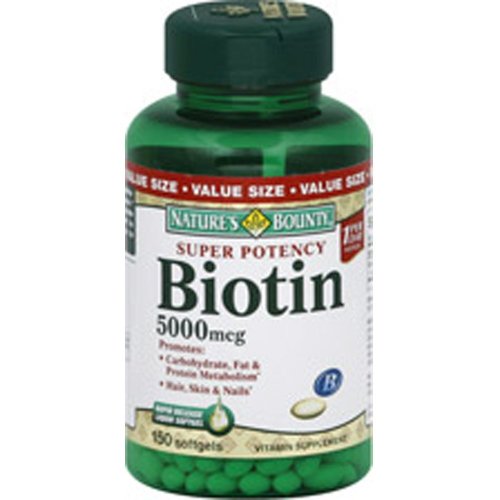 -. Binding : Health and Beauty -. Brand : Nature's Bounty -. EAN : 0074312296192 -. Feature : Case of three bottles, each containing 150 capsules of 5000 milligram Biotin (total of 120 capsules) / Includes biotin to support the metabolism of carbohydrates, fats, and proteins / Biotin also helps to support healthy skin and hair / Guaranteed laboratory tested quality / Easy-to-swallow capsules -. Label : Nature's Bounty -. Manufacturer : Nature's Bounty -. PackageQuantity : 3 -. ProductGroup : Health and Beauty -. ProductTypeName : HEALTH_PERSONAL_CARE -. Publisher : Nature's Bounty -. Studio : Nature's Bounty -. Title : Natures Bounty Super Potency Biotin 5000 Mcg Softgels, 150 Ea (3-pack) -. UPC : 074312296192
