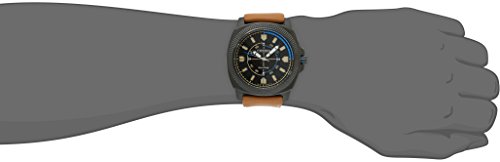 -. Feature : Black ion-plated watch in stainless steel featuring crosshairs graphic on dial, knurled bezel, and leather band with contrast stitching / Japanese quartz movement with analog display / Mineral crystal dial window / Features buckle closure, luminous indexes, and cushion-shape case / Water-resistant to 330 feet (100 M): suitable for snorkeling, as well as swimming, but not diving