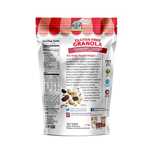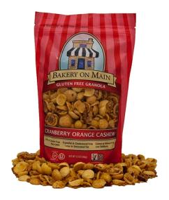 Bakery on Main's Cranberry Orange Cashew, Gluten Free Granola. Case of six, 12-Ounce Packages. Lightly scented with orange and loaded with roasted cashews and dried cranberries all mixed with Bakery on Main’s trademark crunchy corn, rice and seed clusters.