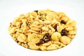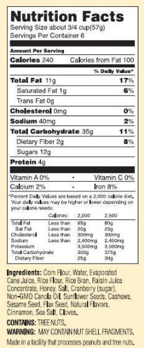 A delicious snack or breakfast cereal lightly scented with orange and loaded with roasted cashews and dried cranberries--mixed with Bakery On Main's trademark crunchy corn, rice, and seed clusters.