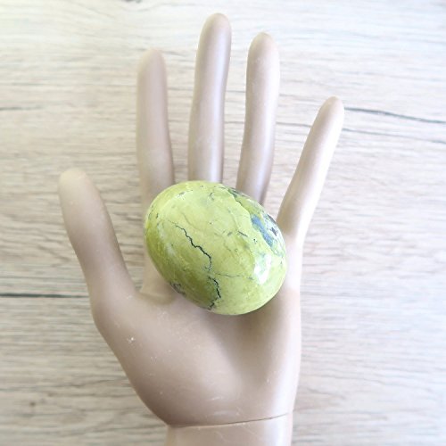 One-of-Kind: Natural Serpentine is polished into your new crystal healing egg. This is a yellowish green stone from Peru showing black mineral inclusions and gold Pyrite patches. The Serpentine is hand-polished into a smooth egg shaped stone, retaining its natural dips, veins and craters. The unique Serpentine egg can be displayed on the included metallic black Hematine ring.