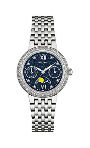 Stainless steel case. Silver-tone stainless steel bracelet features a double-press deployant closure. Round face. Three-hand analog display with quartz movement. Blue sandstone dial features silver-tone hands, diamond hour markers, two-subdials, moon-phase dial, and Bulova detailing. Diamond-embellished bezel. Water resistant 30m. Imported. Your Bulova watch is covered by Bulova's 3-Year Global Warranty.Feature