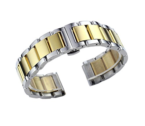 -. Feature : The two tone silver and gold metal watch band comes with straight end. At the length of 180mm, it can be adjusted by removing the links. This heavy type band has a thickness of 4.2mm. For the clasp there are two push buttons forming a quick snap in and release style, which when worn makes the butterfly clasp neatly disappears from view. / Great care has been taken in the finishing of the watch strap. Made of quality 316L stainless steel, our popular watch straps create a fascinating lustre and glossy surface to provide you a pleasing wearing experience. With solid links it is tough and corrosion resistant. / The semi-matte wristbands are polished and grinded with the utmost care during the entire manufacturing process. We also use the best PVD coating technology to ensure the long lasting of the color. These time-intensive production processes guarantee the highest possible wearing comfort and the long durability and joy of our products. / The watch band is compatible with most watch brands with standard lug end such as Tissot, Longines, Wenger, IWC, Rolex, Mido, Omega, Cartier, Tudor, Movado, Rado, Hamilton, Titoni, Certina, Swiss Military, MontBlanc, Armani, Jaeger, Invicta, Zenith, Orgival, Ranceas, Timex, tw, rotary, Kreisler,etc. / We offer a wide range of straps with a variety of sizes and colors to meet your watch needs. (size: 15mm, 16mm, 17mm, 18mm, 19mm, 20mm, 21mm, 22mm, 23mm, 24mm, color: black, silver, gold, rose gold, dual tone silver and black, dual tone silver and gold, dual tone silver and rose gold). All of our stainless steel watch bands are resistant to water, sweat, torsion, UV exposure, and rubbing, but it is recommended to wash them with hot water and tooth paste once a month.