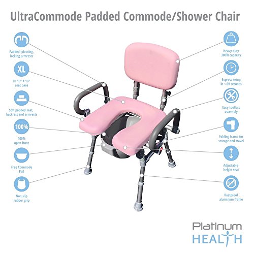 Studio : Platinum Health Publisher : Platinum Health Binding : Health and Beauty Product Description What good is a commode with no access to the perineal area? Virtually every old-style, economy commode sold on the market today has this critical design flaw. For proper cleaning, users require an open, unobstructed front. Users also require a seat base dimension and a "distance between the armrests" dimension that allows for some body movement. Almost all commodes available today ARE TOO SMALL. Only the UltraCommode Foldable Commode addresses all of these issues and more. Designed for users who value quality, safety, comfort and convenience over price, the UltraCommode is the perfect choice for users and caregivers who require a versatile, multi-use chair that can be used in a number of different toileting and bathing scenarios. Unlike old-style, cold, hard plastic seating surfaces, the UltraCommode is equipped with premium padded, super-comfortable, easy-to-clean seat surface, armrests and backrest. The adjustable seat height allows the chair to safely accommodate any user. Pivoting armrests allow for even greater access to the body and help make transfers on and off the chair quick and easy. Folding and unfolding the chair can be accomplished in less than 60 seconds without tools making storage and travel a breeze. This premium chair can be used as a standalone commode and includes a FREE plastic commode pail. IT IS ALSO DESIGNED TO BE USED AS A SHOWER CHAIR- 2 PRODUCTS IN 1! The premium foam padding will not absorb water and the robust, heavy duty aluminum frame will never rust. Platinum Health products are commercial grade and guaranteed for life. They are used in hospitals, senior living facilities and homecare settings worldwide. Order this best-in-class commode/shower chair today to make toileting and bathing easier, safer and more comfortable than ever. Max. 300lbs. IMPORTANT! THIS IS A BEDSIDE COMMODE/SHOWER CHAIR- IT IS NOT INTENDED TO BE USED OVER A TOILET- IT WILL NOT FIT. A TOILET COMPATIBLE VERSION IS HERE: https://www.amazon.com/dp/B011LEH 0