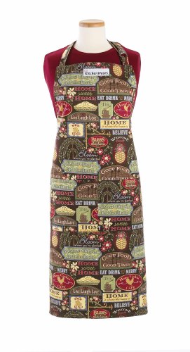 • 100-Percent cotton twill "Home Sweet Home" printed apron features old fashioned home themes on a chocolate background
