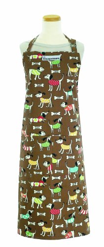 • 100 percent cotton twill bone appetite printed apron features smiling dogs in sweaters on a brown background