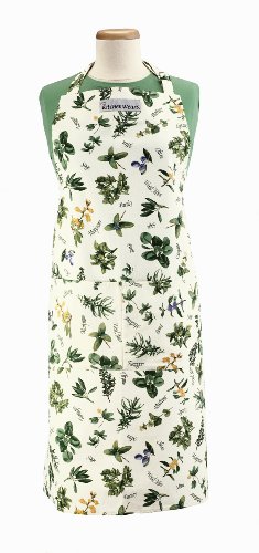 • 100-Percent cotton twill "Herb Thyme" printed apron features drawings and names of various herbs on a white background