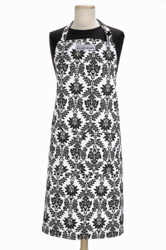 • 100-Percent cotton twill "Vintage Damask" printed apron features a bold black pattern on a white background
