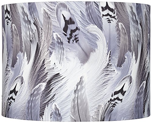 -. Feature : Gray and black drum lamp shade. / Digital P.R.Int of a feather pattern. / Rolled edge. / Unlined. / Chrome finish spider fitter.