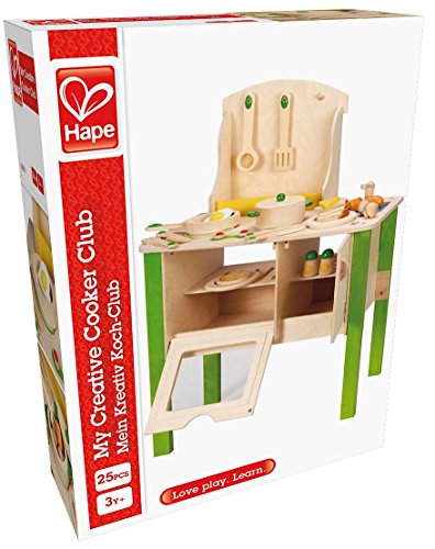 The ultimate wooden toy cooking set! With the Hape Creative Cookery, the options for play are endless and varied! Your child can host a cooking party in the playroom, or maybe just enjoy an afternoon of baking up cupcakes, pizza, spaghetti, and more! Featuring an oven, stovetop, utensil rack, sink, refrigerator, and so much more! Open shelves on both sides offer easy accessibility on either side. With its bright colors, various pots and pans and food selections, imagination is certainly on the menu! Durable child safe paint finish and solid wood construction make this a toy your child will love for years to come. Hape toys stimulate children through every stage of development and help nurture and develop their natural abilities. All Hape products sold in North America meet or exceed all applicable safety standards.Feature
