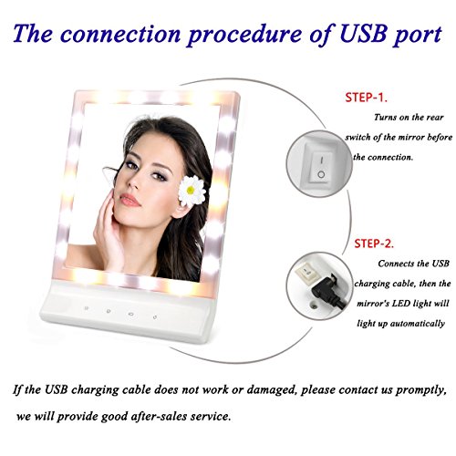 ❀Portable Power Supply - Powered by 4pcs Batteries or USB Cable.The mirror can support UBS cable charging without batteries,and you can use the batteries and usb cable together if you want a more bright light.