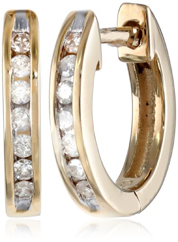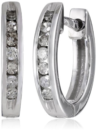 A beautiful pair of diamond hoop earrings adds a touch of class to any ensemble. These petite hoops are offered in your choice of polished 10 karat white or yellow gold and hold a total of 14 round diamonds (1/6 cttw), mounted in secure channel settings. They have a beautiful sparkle and shine and look perfectly apropos with a daytime or evening outfit. The hoops have a hinged design with hidden snap posts for a seamless fit.Feature