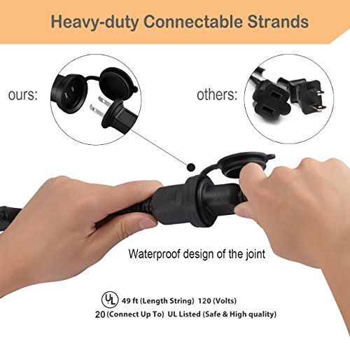 - Heavy-duty Weatherproof Commercial Quality Lights: Our product is UL listed, which is made of high quality materials, the light cord is massive and flexible, sockets and connector are also fully wrapped design to prevent water in(different from products in the market). All of these design ensures the lights is waterproof, heatproof, enable to withstand a variety of weather for several years using.