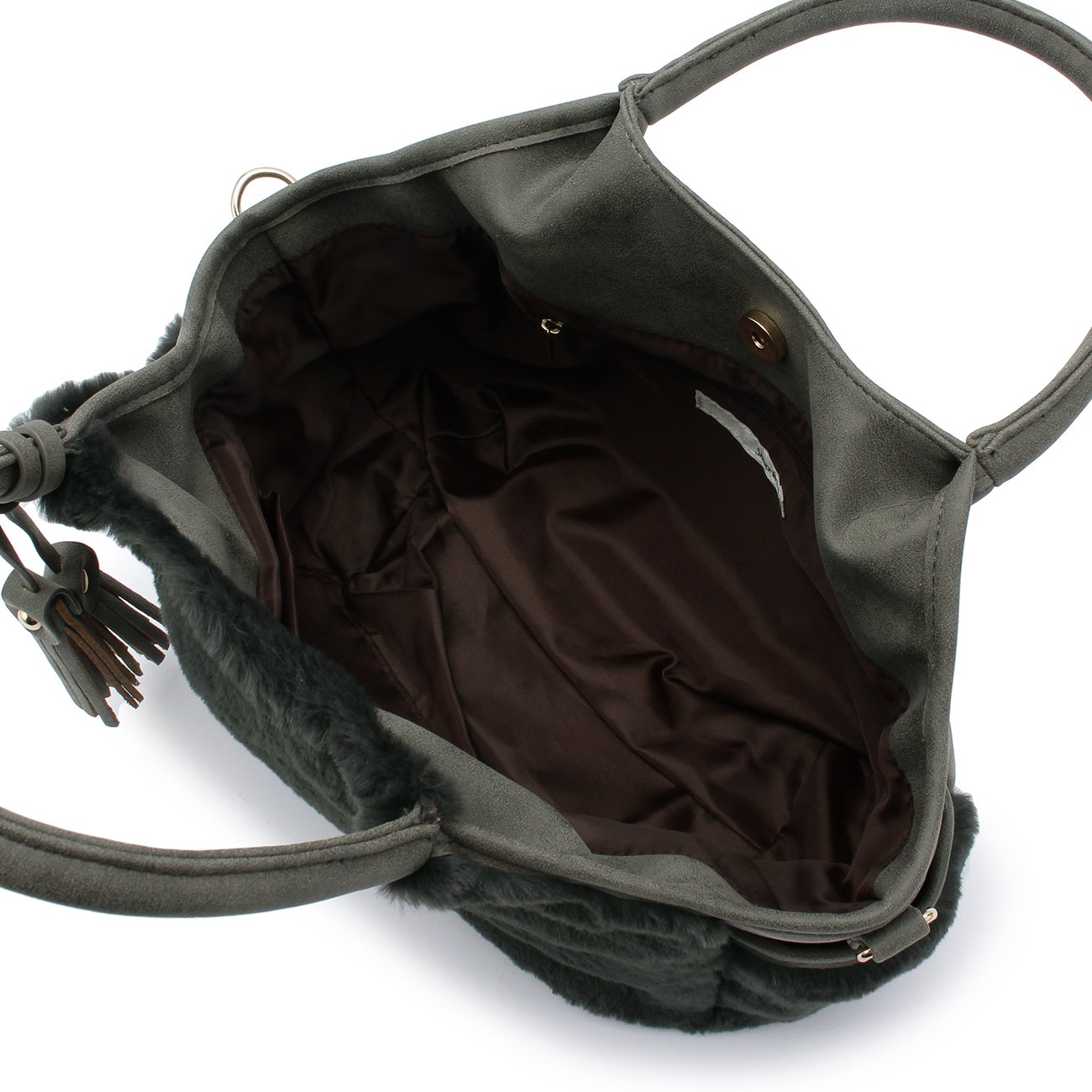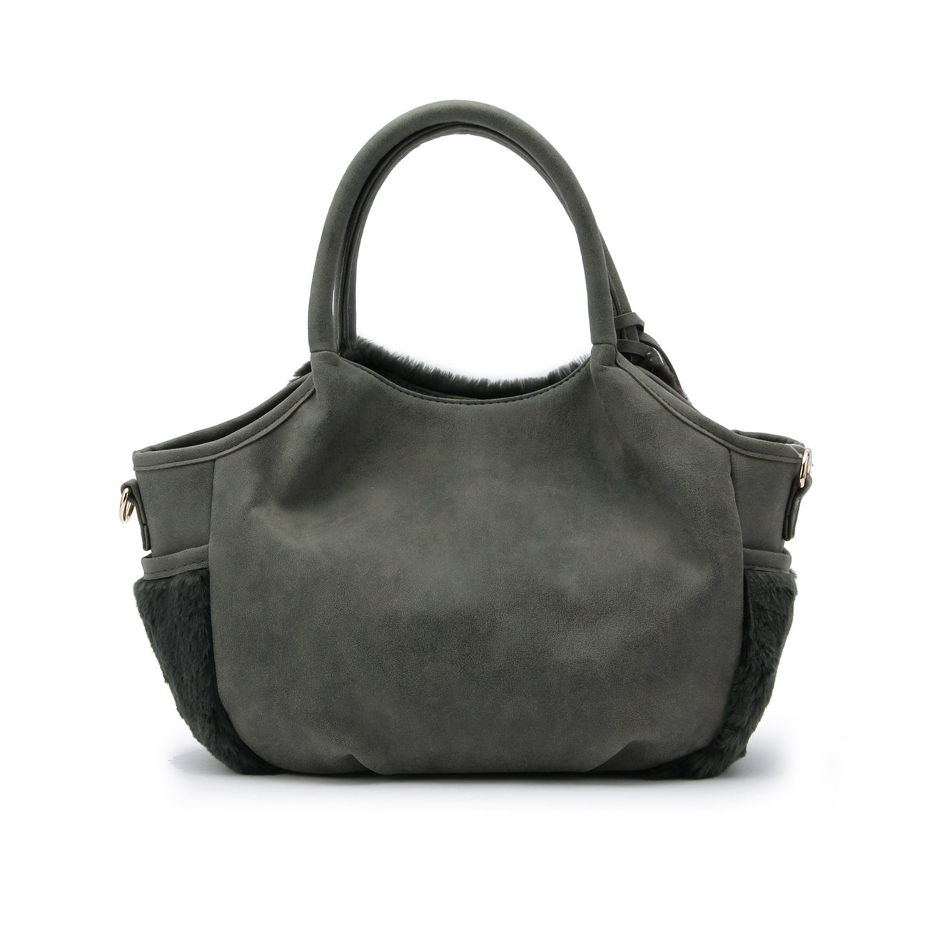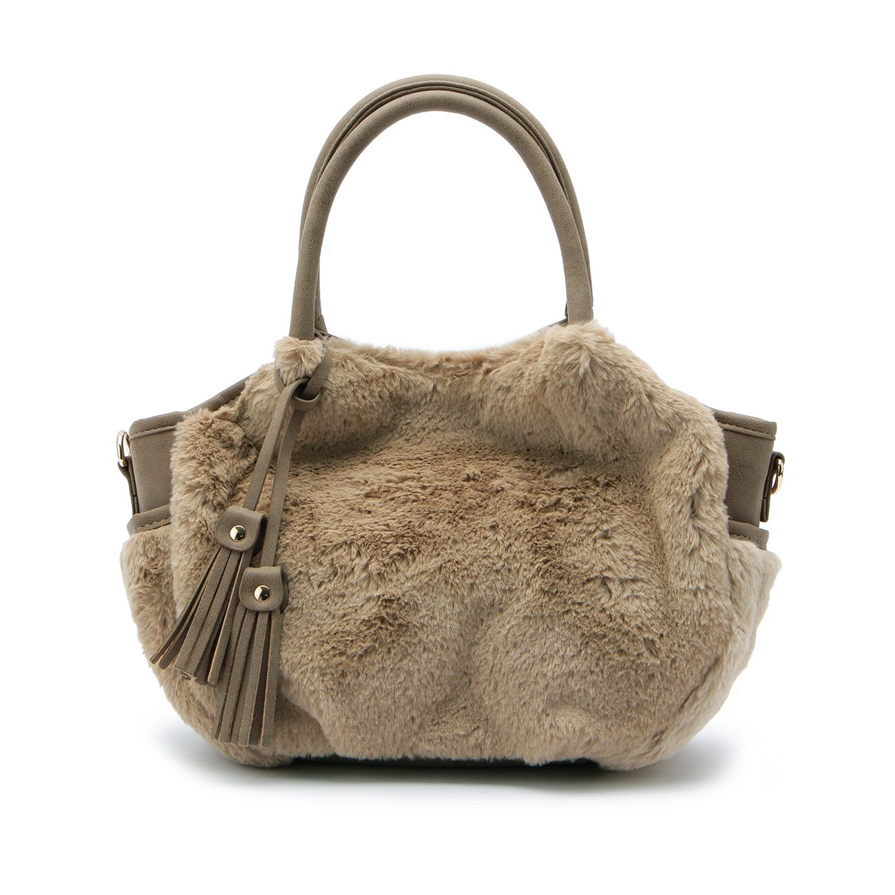 Double faced tote bag combining fake fur on one side and leather-like fabric on the other side.